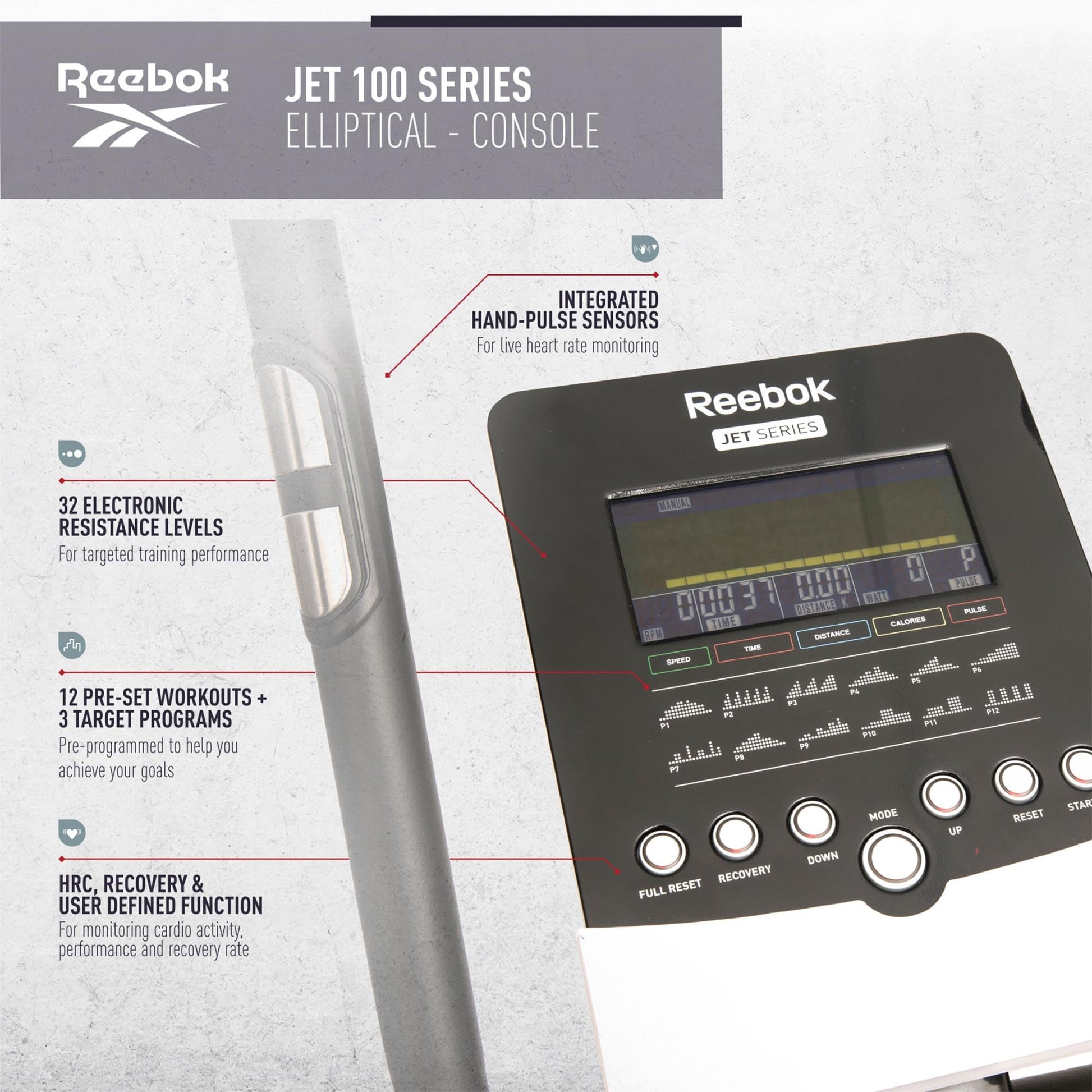 Einzelheiten: Der Reebok Jet 100 Series Crosstrainer ist ein höchst effektives Cardiogerät das gleichzeitig Ober- und Unterkörpermuskulatur beansprucht. Das große 9kg Schwungrad bietet einen flüssigen, leisen Bewegungsablauf und ein schonendes Training. Das bedeutet allerdings nicht, dass keine anstrengenden Workouts hiermit absolviert werden können.Widerstandsstufen sind essentiell wichtig zur Verbesserung der Leistungsfähigkeit und des Fortschritts. Der Jet100 bietet Ihnen durch 32 Widerstandsstufen und 19 Trainingsprogrammen uneingeschränkte Abwechslung. Das beleuchtete Display ermöglicht einen Überblick über Trainingszeit, zurückgelegter Strecke, Herzfrequenz sowie verbrannte Kalorien. Um sicherzustellen, dass Sie sich in der Fettverbrennungs- und gewünschten Herzfrequenzzone befinden, besitzt der Jet100 Crosstrainer integrierte Handpulssensoren. Umgreifen Sie hierzu lediglich die beiden Griffe, und schon erscheint Ihre Herzfrequenz auf dem Display. Das einzigartige Design des frontangetriebenen Crosstrainers ermöglicht Ihnen ein anspruchsvolles Training ohne den Rücken oder die Beine unangenehm zu belasten.